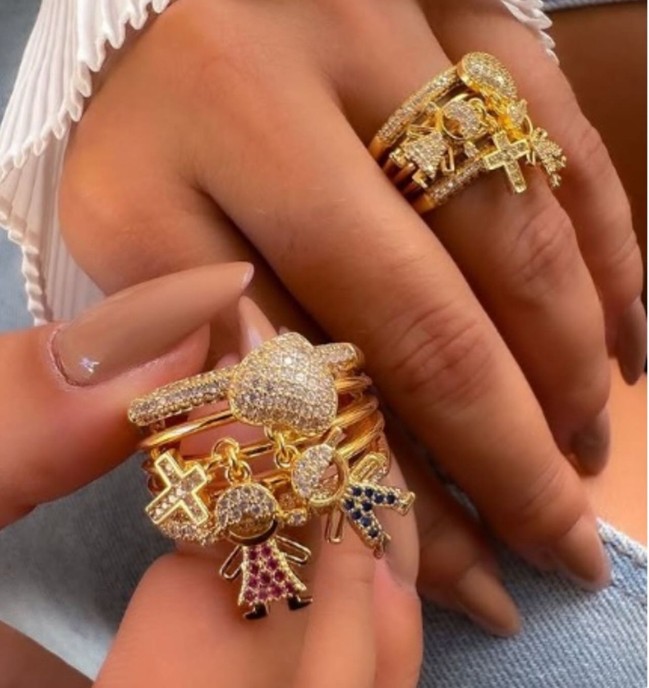 Anel filho casal cravejado com pedras de zircônia, banhado a ouro 18k.