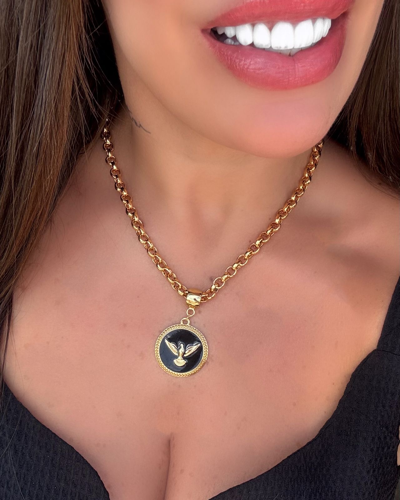 Colar Espírito Santo cor preto redondo, Banhado ouro18k